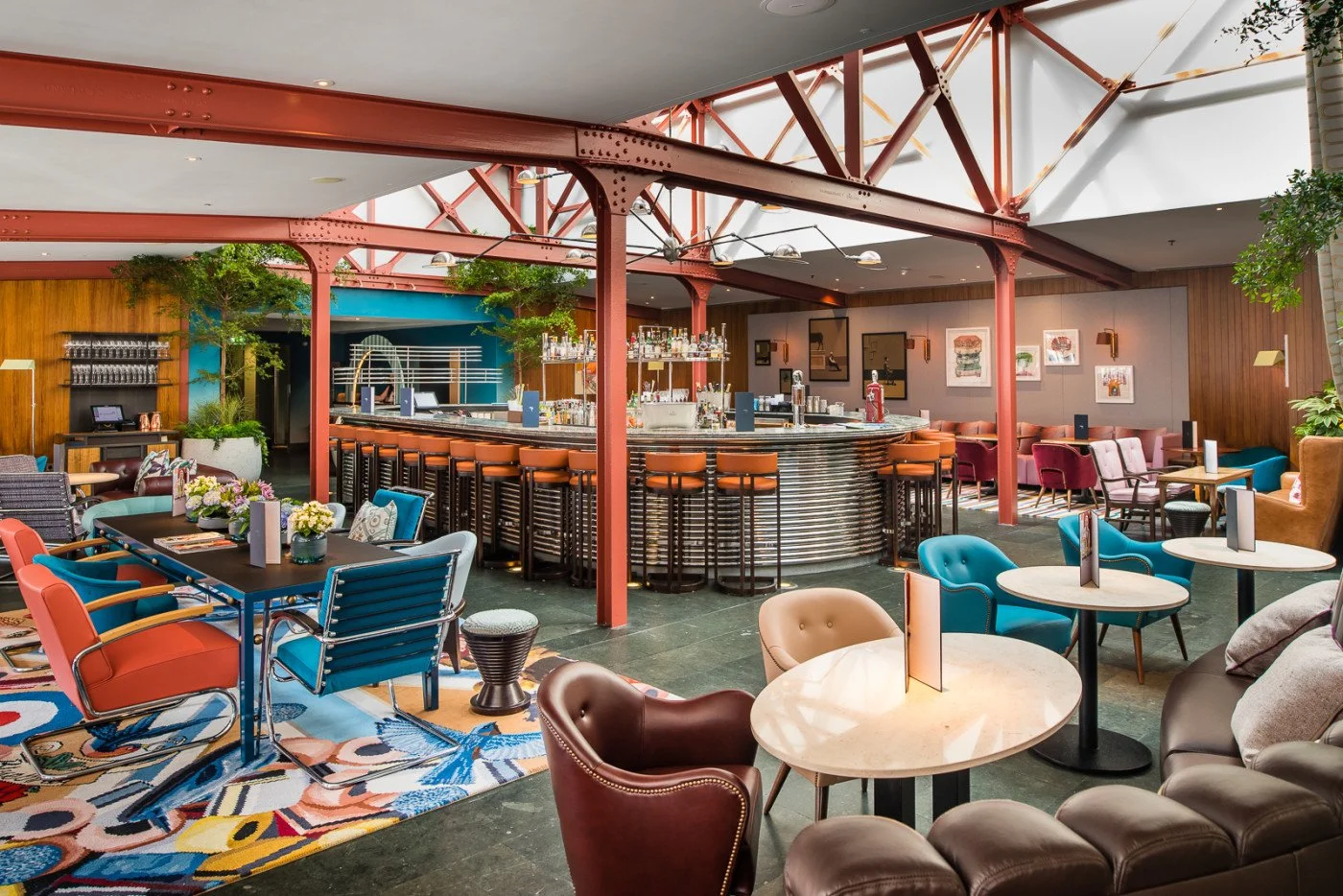 The revamp celebrated the building’s roots—it was the first garage of the Bluebird Motor Company in 1923. The atrium features many kinds of foliage, with fabrics and textures alluding to English racing.