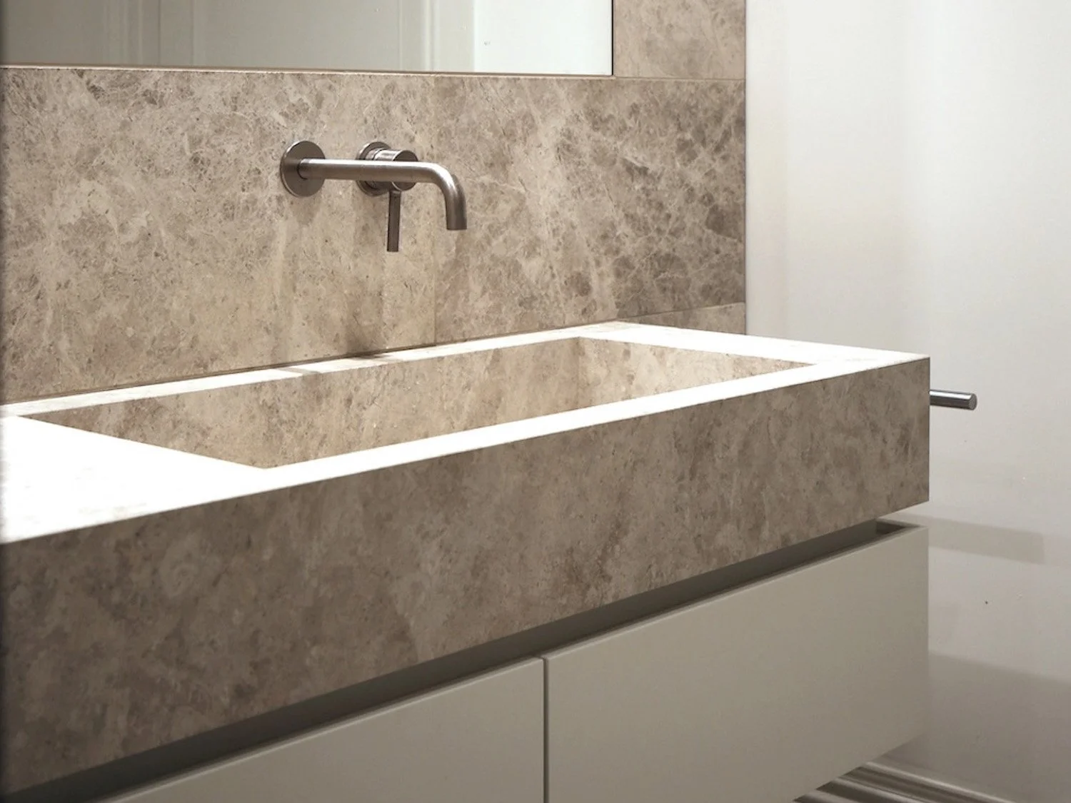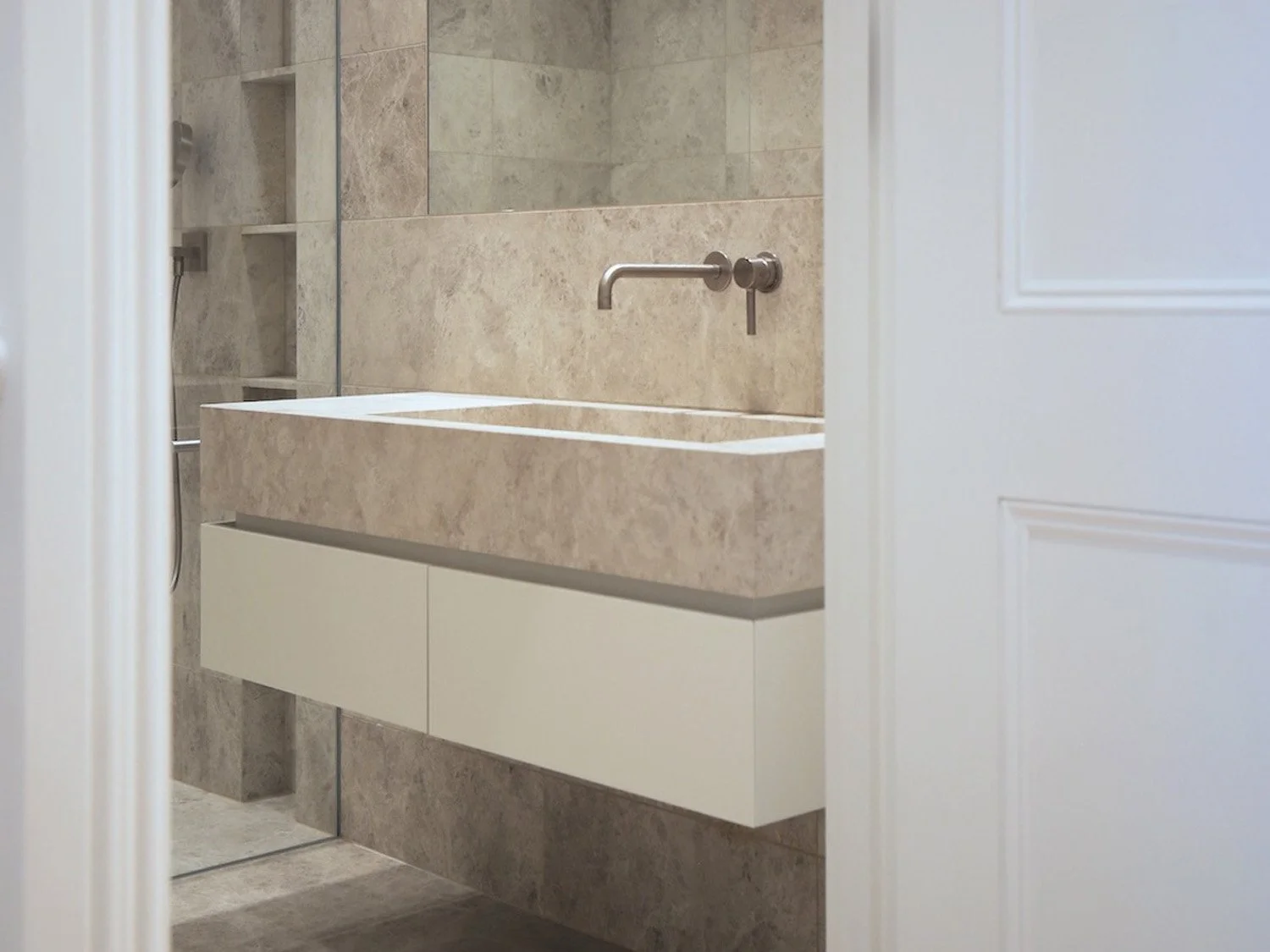 Supply only of Bianco Carrara marble floor and wall cladding, as well as bespoke vanity, for the guest WC