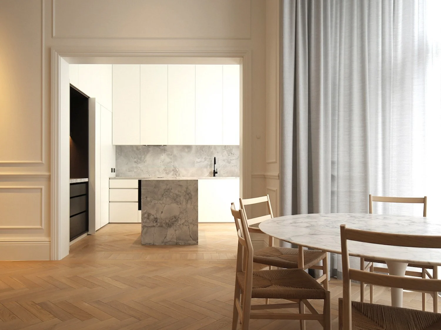 As part of the refurbishment of a large flat within a period building in Belsize Park, the interiors are luxurious and modern and yet practical for everyday life.