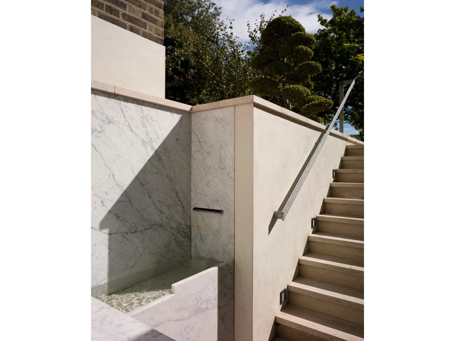 Stonework at this large Georgian house on Shooters Hill in Blackheath (SE London), consisting of a stone water feature in Carrara marble, inspired by Renaissance fountains in Cordoba.